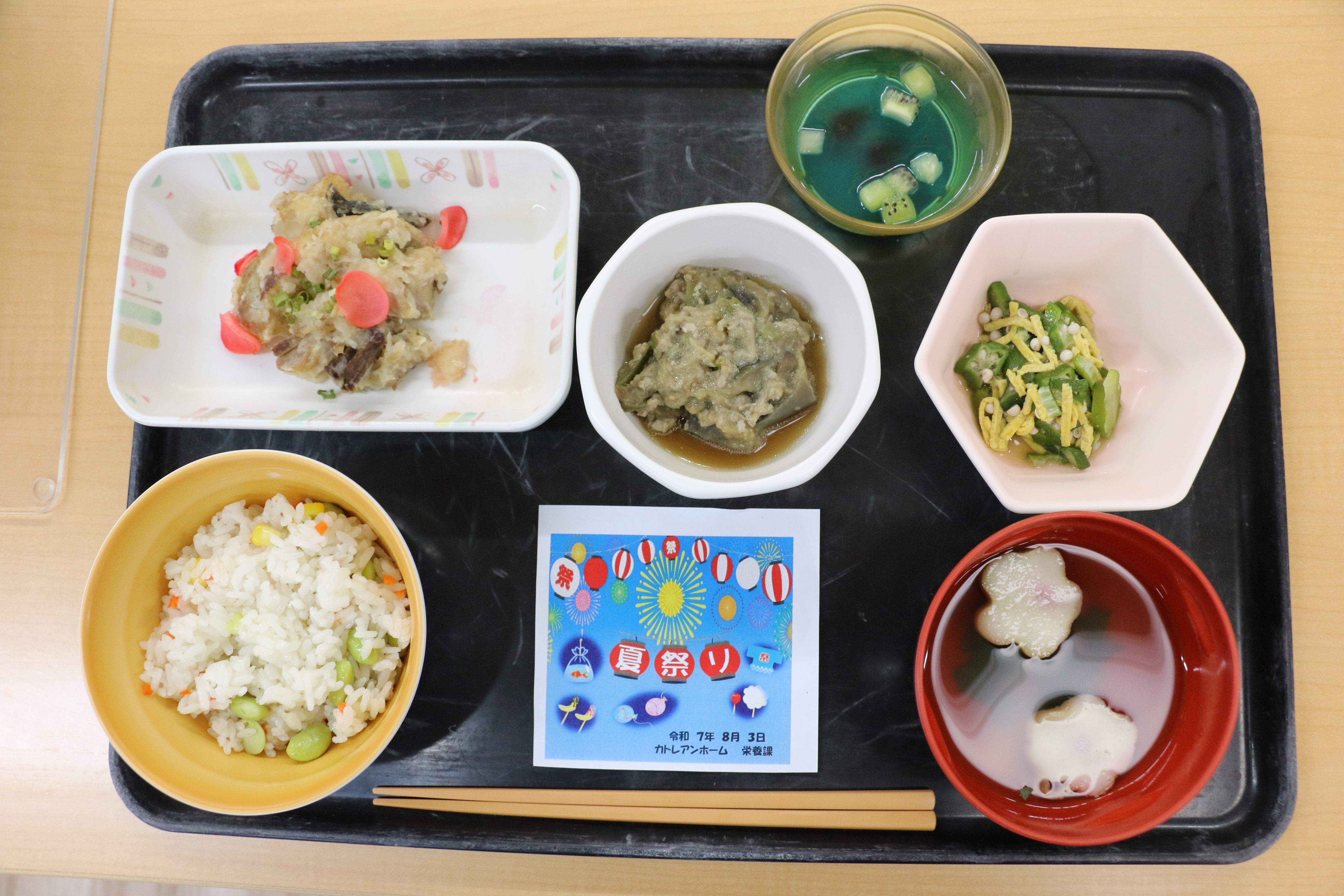2階 納涼祭~昼食編~ 2025.08.01 🍅納涼祭昼食編🍅 8月3日はカトレ納涼祭!! お昼ご飯は夏野菜たっぷりメニュー✨ 栄養課より、記念カードのプレゼント!!いっぱい食べて納涼祭に臨みます🔥 一覧に戻る