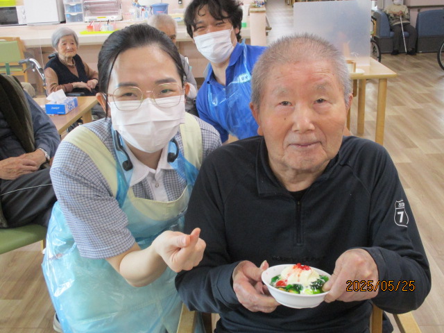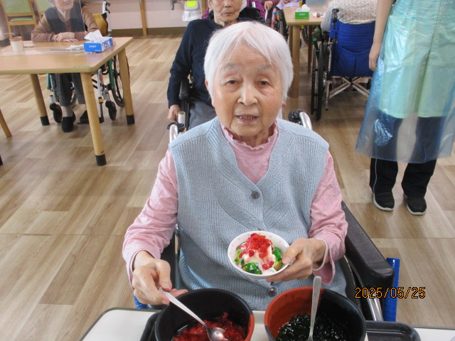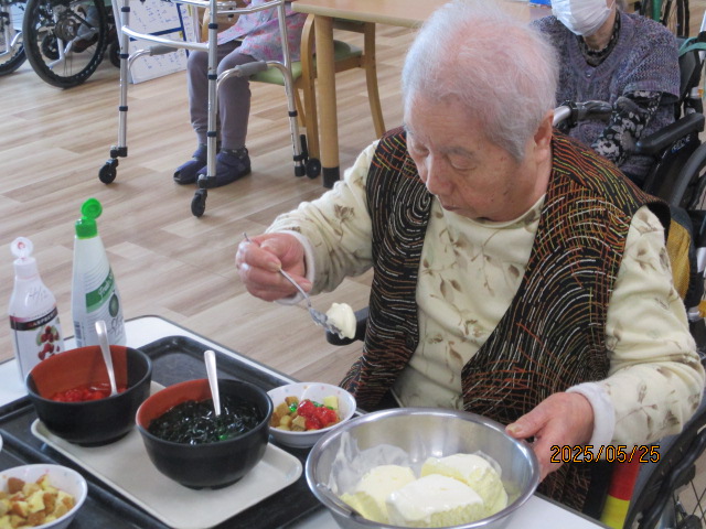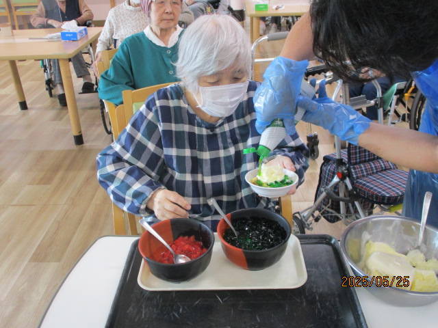 スポンジケーキやプリンの上にアイスクリーム、メロンゼリー、メロンソース、フローズンフルーツをお好みで乗せておいしいパフェの出来上がり♪自分で作ったパフェは格別に美味しかったですね(*'▽')