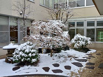 1階フロアから見える日本庭園風中庭のお昼前はこんな感じ。