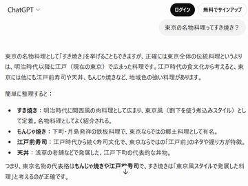 「東京の名物料理として“すき焼き”を挙げることもできますが、正確には東京全体の伝統料理というよりは、明治時代以降に江戸(現在の東京)で広まった料理です。江戸時代の食文化から考えると、東京には他にも江戸前寿司や天丼、もんじゃ焼きなど、地域色の強い料理があります。つまり、東京名物の代表格はもんじゃ焼きや江戸前寿司で、東京風スタイルで発展した料理が“すき焼き”と考えるのが正確です。」とのこと。